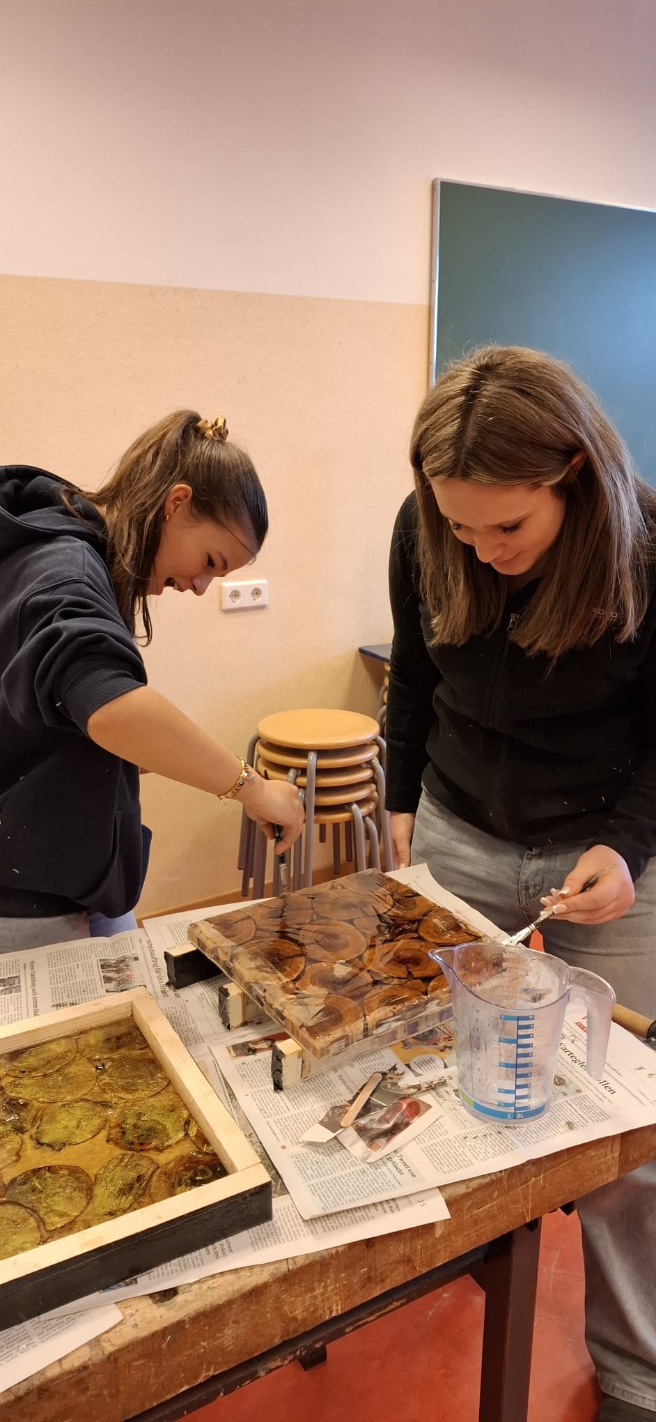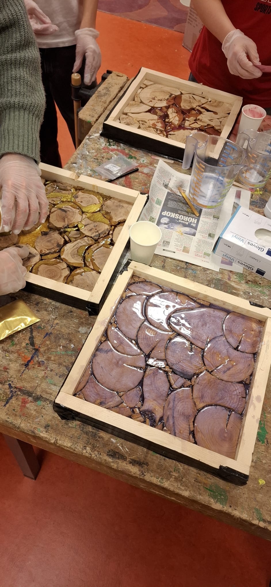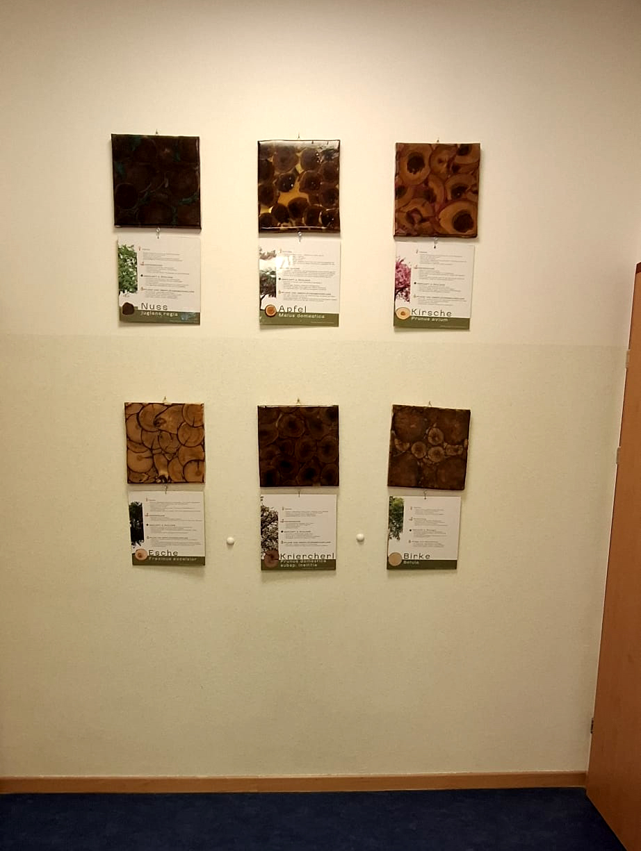 Im Rahmen eines fächerübergreifenden Projekts in Technik und Design sowie Kunst und Gestaltung haben unsere Schüler:innen Holztafeln aus Baumscheiben verschiedener Holzarten gestaltet und mit farbigem Epoxidharz vergossen. Die einzelnen Holzstücke wurden wie ein Puzzle zusammengesetzt – jede Arbeit ist ein echtes Unikat.